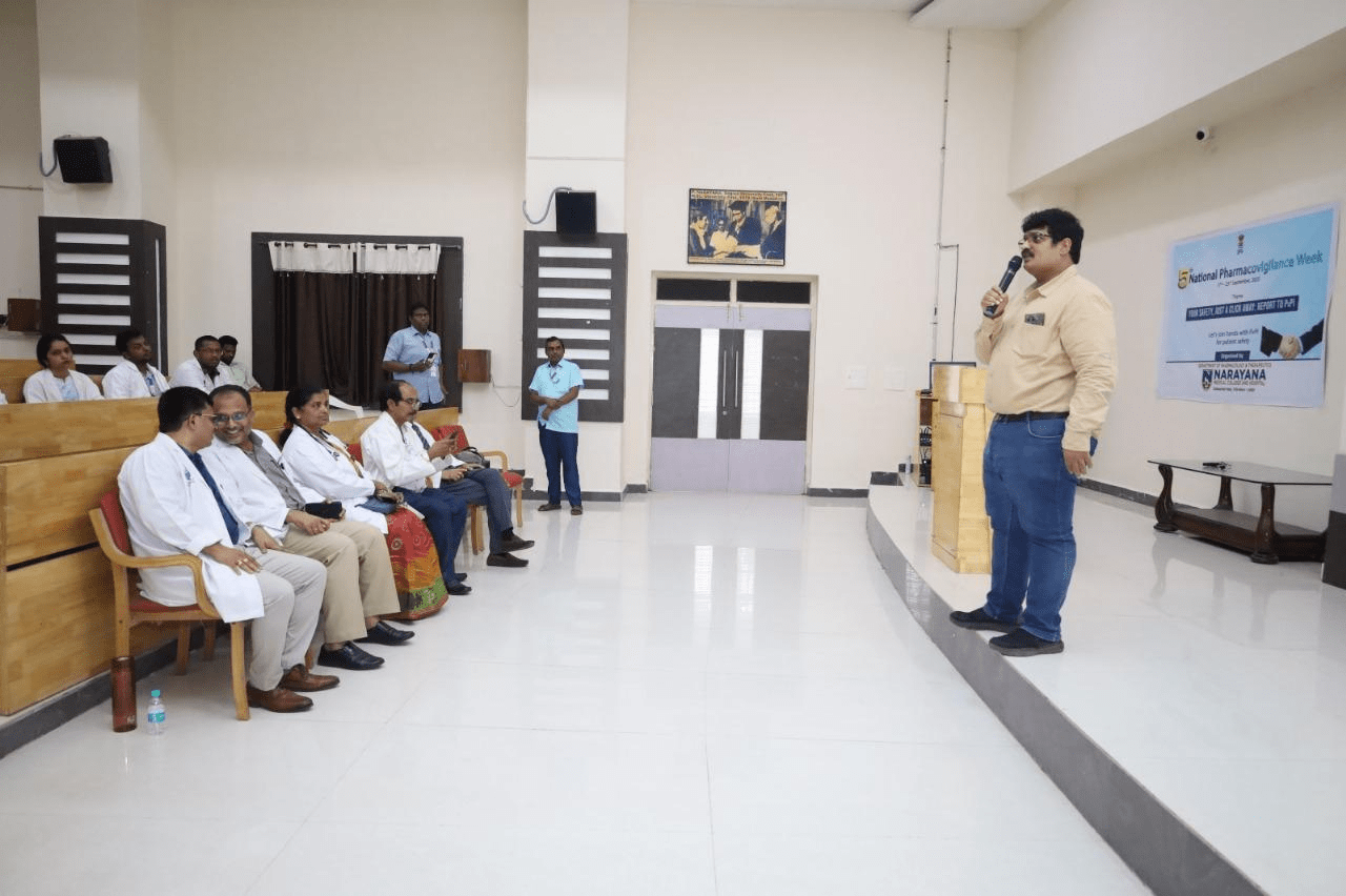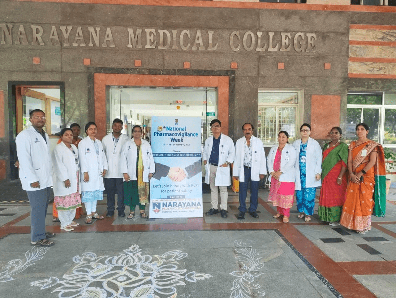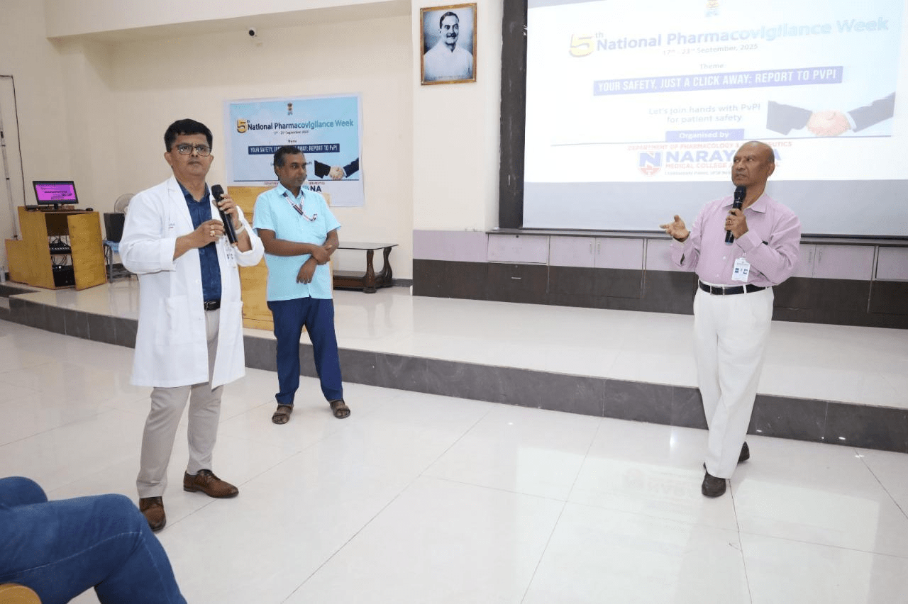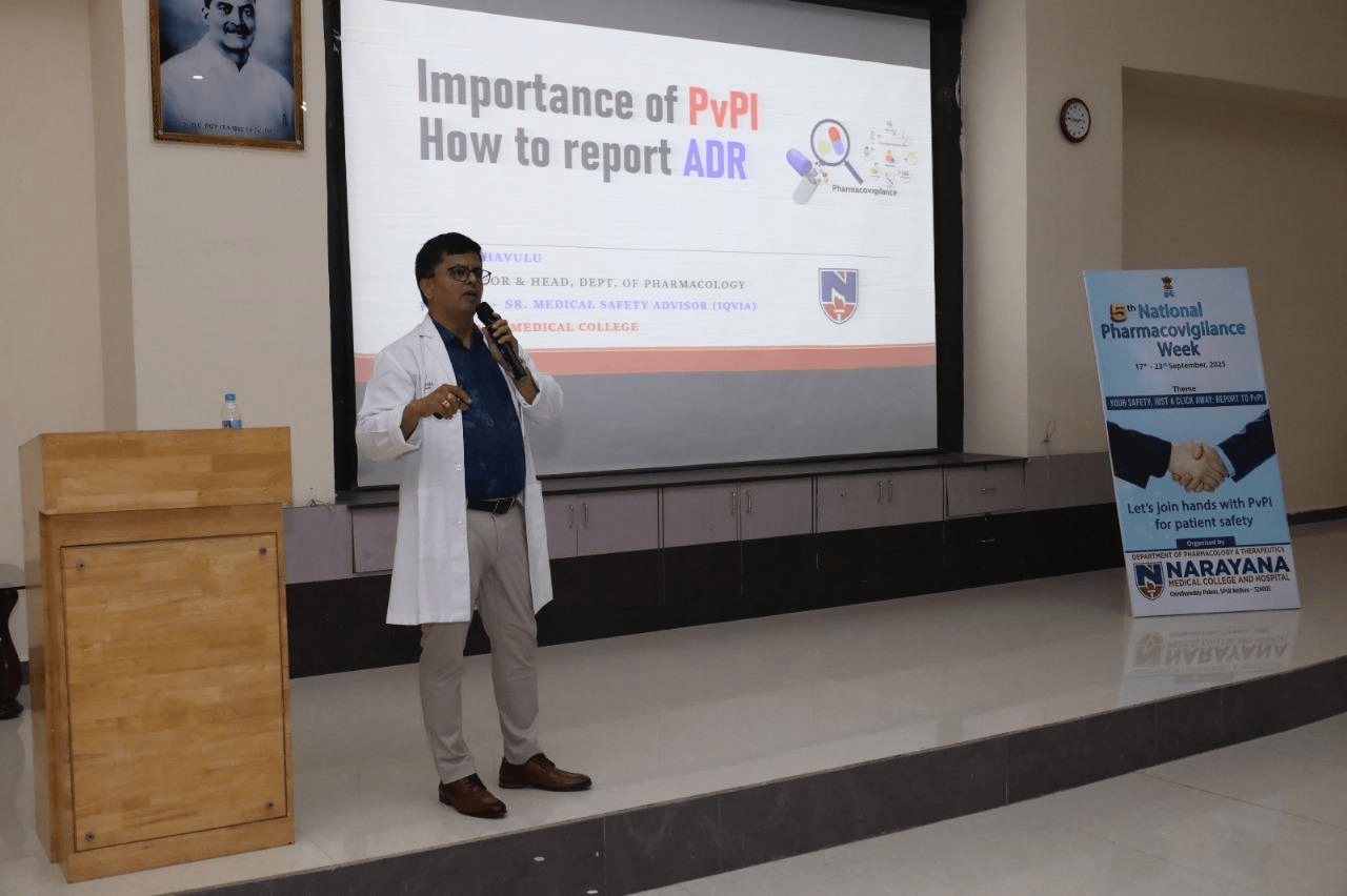 The Dept. of Pharmacology and Therapeutics at Narayana Medical College & Hospital marked the 5th National Pharmacovigilance Day celebrations on September 17, 2025. As a part of the Common Academic program event, held at the B.C. Roy Lecture Gallery, inaugurated by our Dean, Dr. P. Sreenivasulu Reddy Sir, and Dr. M. Dorasanamma Madam, Additional Medical Superintendent. Dr. Madhavulu, HOD – Pharmacology, delivered an interactive guest lecture on the critical role of the Pharmacovigilance Programme of India (PvPI) and provided essential guidance on how to report ADRs to the medical faculty and postgraduates. Team Pharmacology thanked all the Senior, Jr. faculty and post-graduates who participated the event. Special thanks to Dr Krishna Chaitanya for moderating the event.