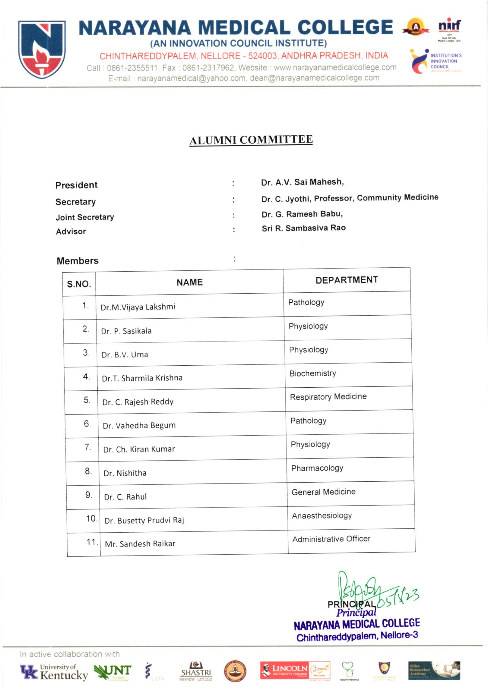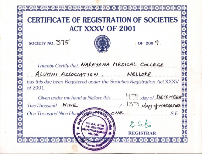- To serve as a structured forum that strengthens relationships among alumni, current students, faculty, and the management of Narayana Medical College, Nellore.