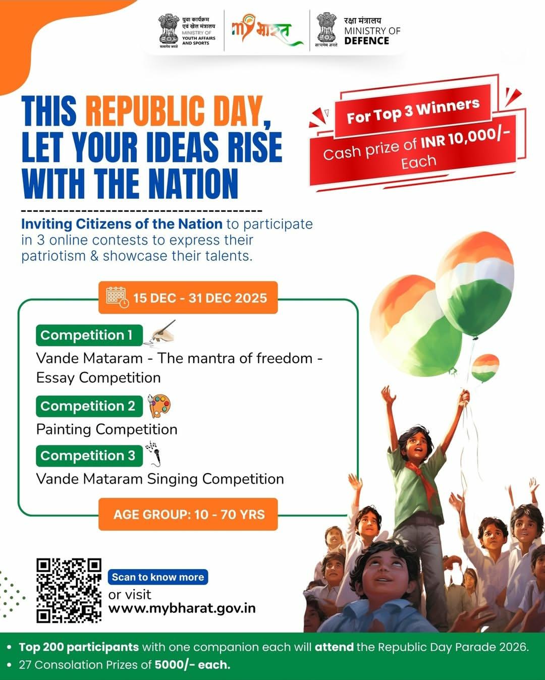 I request you all to actively participate in the competitions on the My Bharat App. This is a great opportunity where you can win exciting cash prizes and also stand a chance to participate in the prestigious Republic Day Parade 2026.