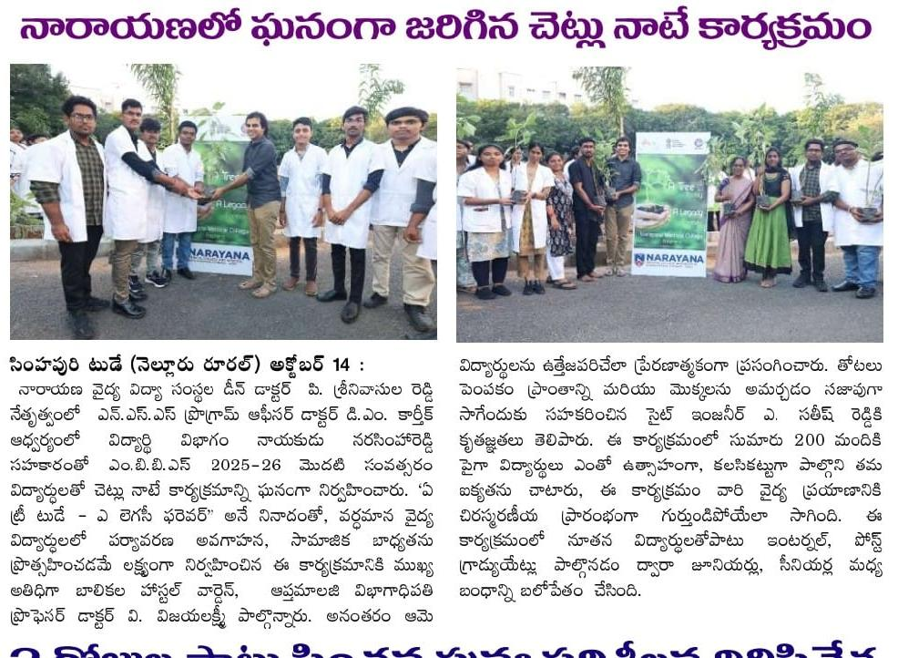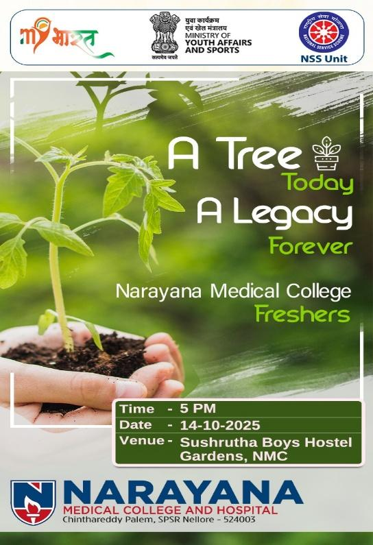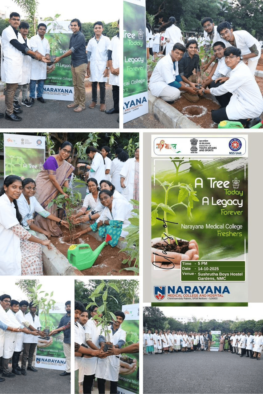 A Tree-plantation program  was successfully conducted at the Sushrutha Hostel Gardens of Narayana Medical College, where the freshers of the MBBS 2025–26 batch actively participated with great enthusiasm. The event was organized under the guidance of Dr. P. Sreenivasulu Reddy,  Dean  of Narayana Medical  College  and  Hospital,  and coordinated by the NSS Unit led by Dr. D. M. Karthik, NSS Program Officer along with unit members Mr Narasimha Reddy, NSS student representative with the inspiring theme “A Tree Today, A Legacy Forever,” the initiative aimed to promote environmental awareness and  social  responsibility among  the budding  medical professionals. The program  was graced   by  Dr.  Valathuru  Vijayalakshmi,  Professor and  Head  of  the  Department  of Ophthalmology and  Warden  of the  Girls’ Hostel,  who served  as  the  chief  guest  and encouraged the students through her motivating words and active participation.