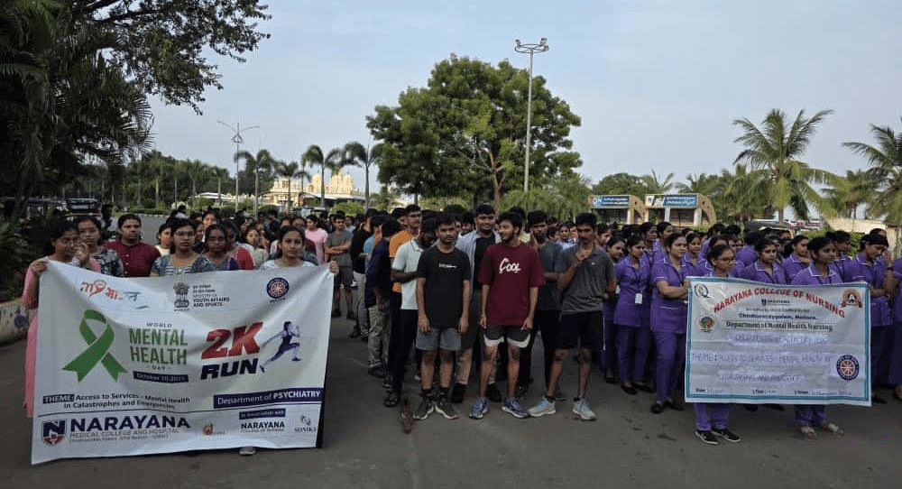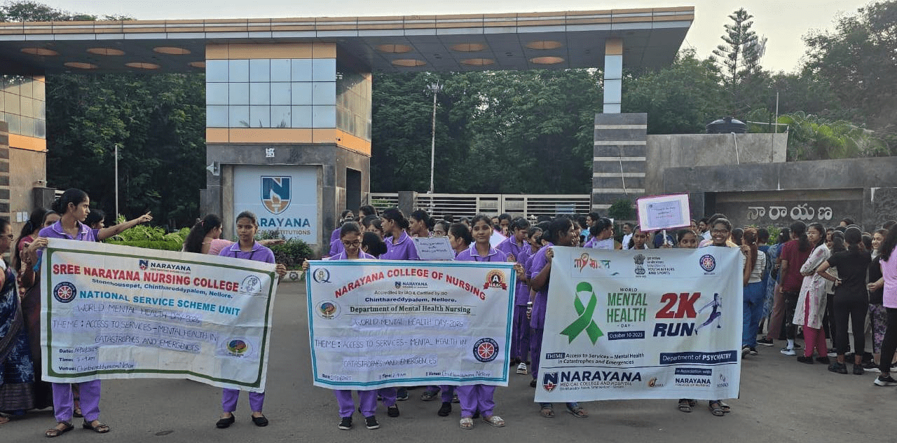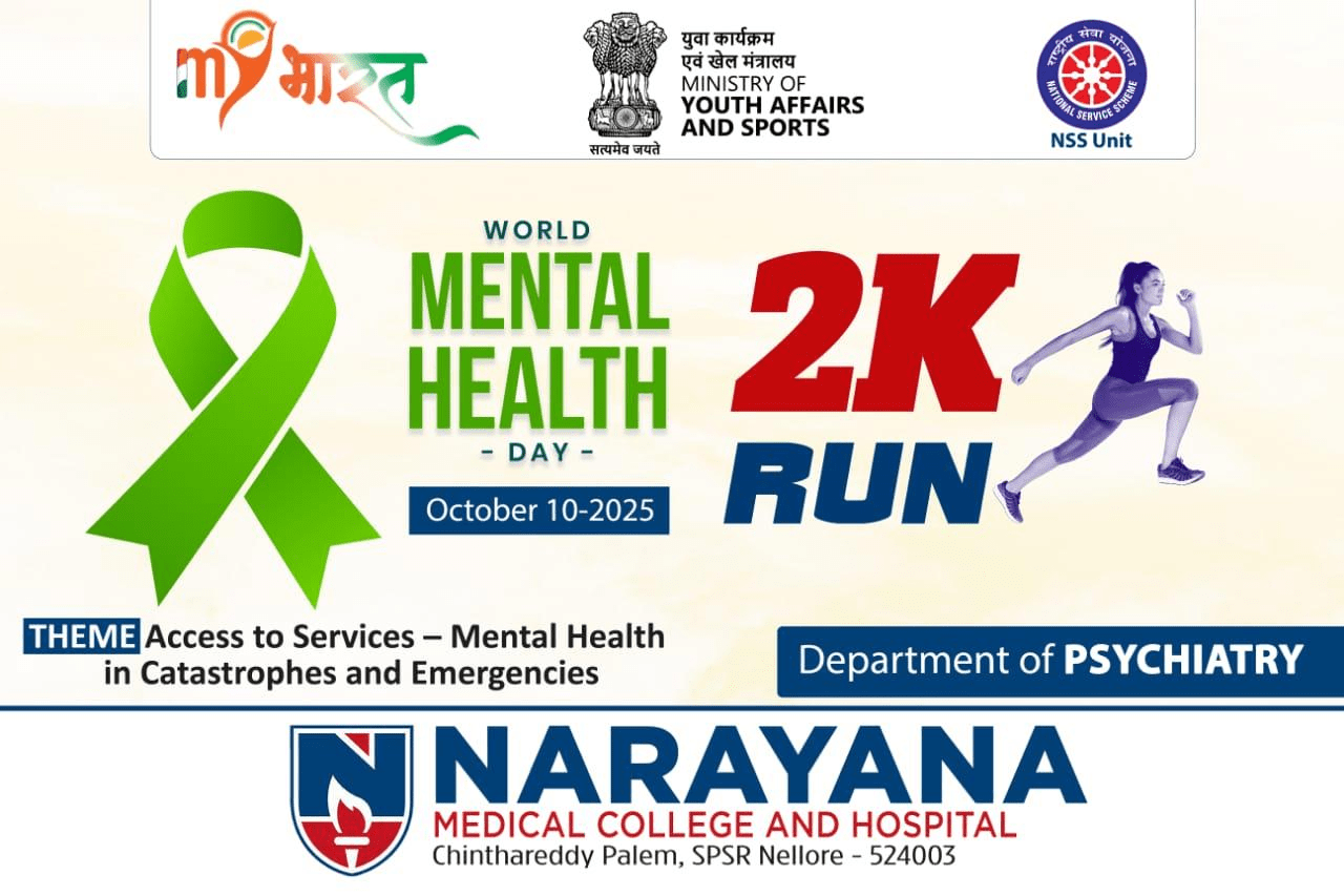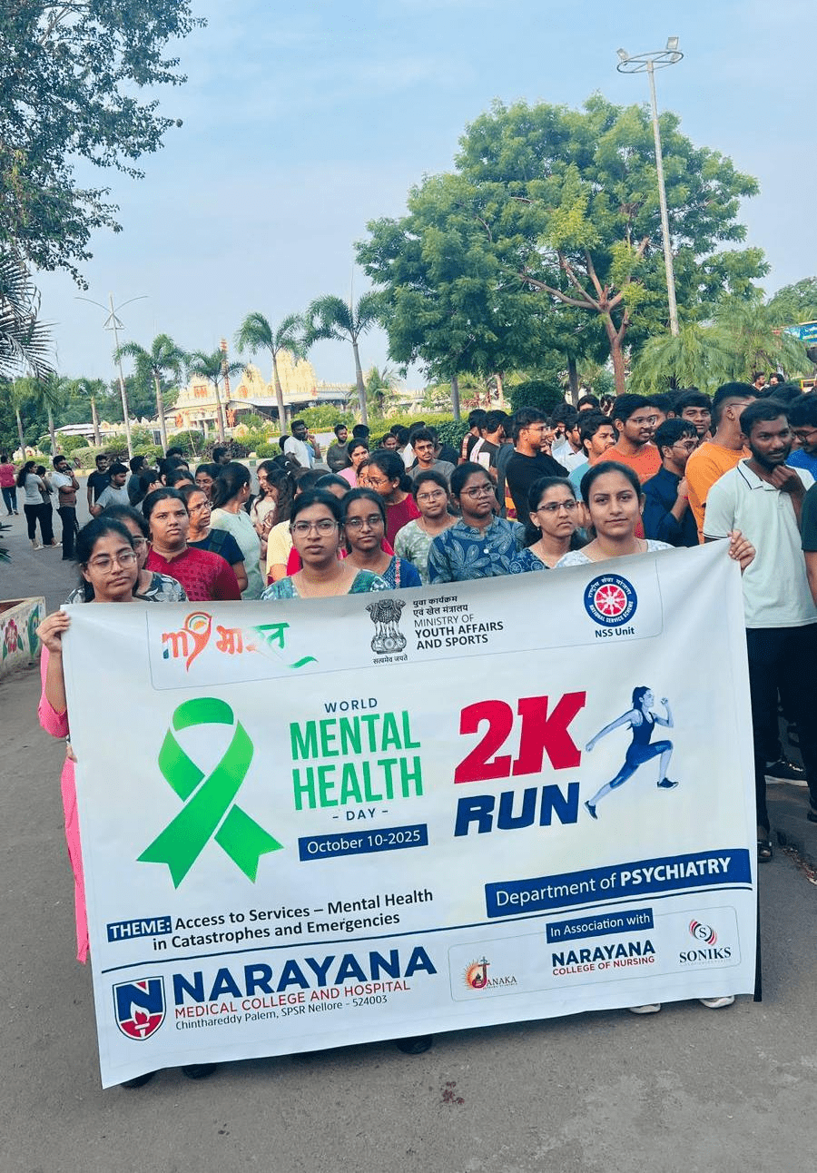 The World Mental Health Day was celebrated grandly on October 10th, 2025, at Narayana Medical College and Hospital, under the theme of promoting awareness about ACCESS TO SERVICES – MENTAL HEALTH IN CATASTROPHES AND EMERGENCIES. The event was organized by the Department of Psychiatry in association with the National Service Scheme (NSS) Unit of Narayana Medical College and Hospital, under the guidance and leadership of Dr. P. Sreenivasulu Reddy Garu, Dean, Narayana Medical College and Hospital.