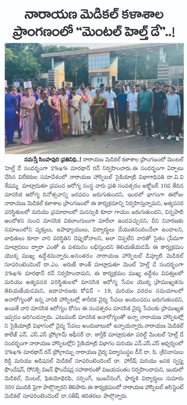 Organized by: Department of Psychiatry in association with NSS Unit, Narayana Medical College and Hospital Under the guidance: Dr P Sreenivasulu Reddy, Dean NMCH