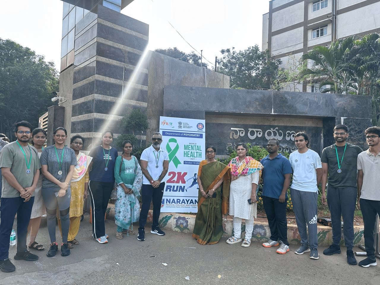 The celebrations began early in the morning with an enthusiastic 2K Marathon Run conducted at the Narayana Medical College Main Gate entrance to Parthasaradhi Nagar Arch and back to Narayana Medical College Main Gate , Nellore which aimed to create awareness about mental health and the importance of physical activity in maintaining psychological wellness.