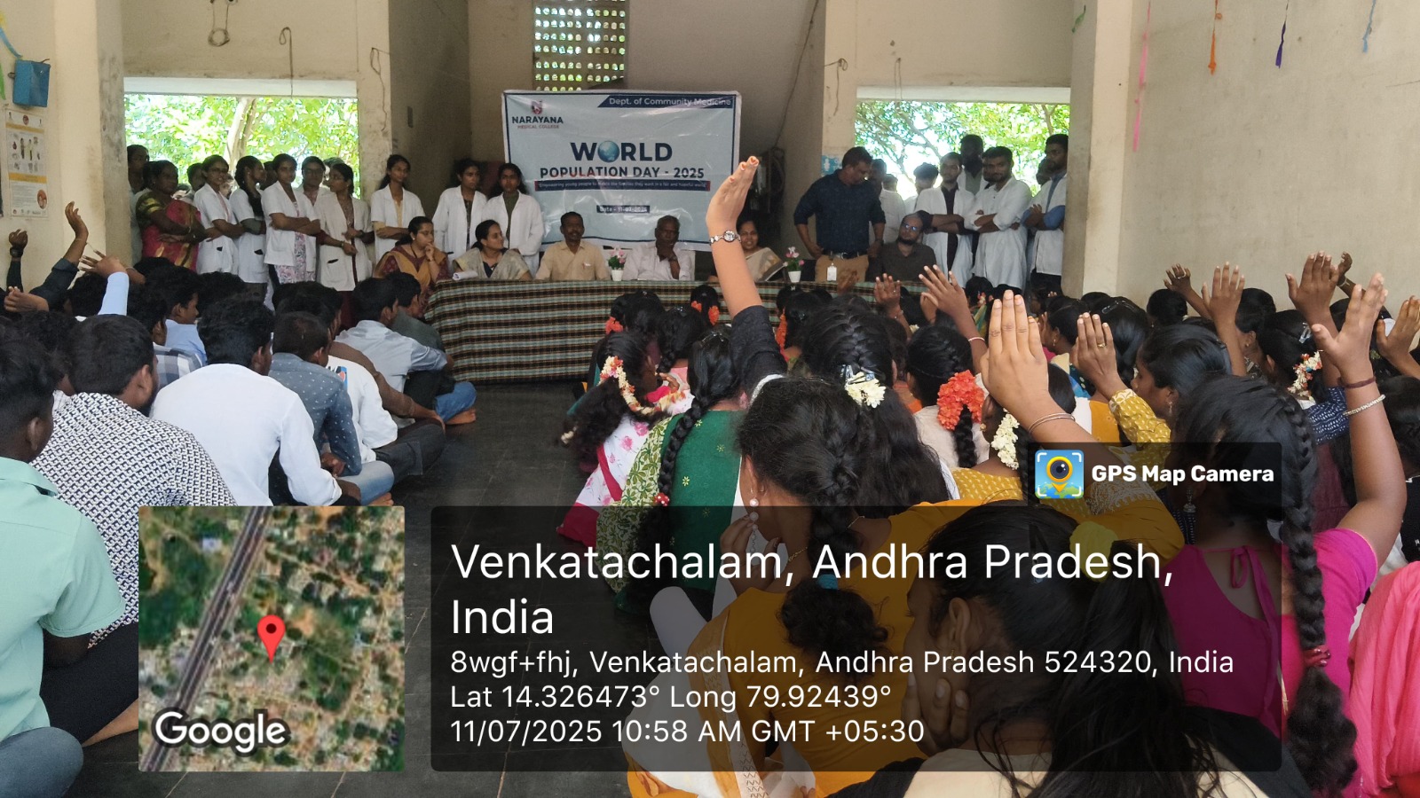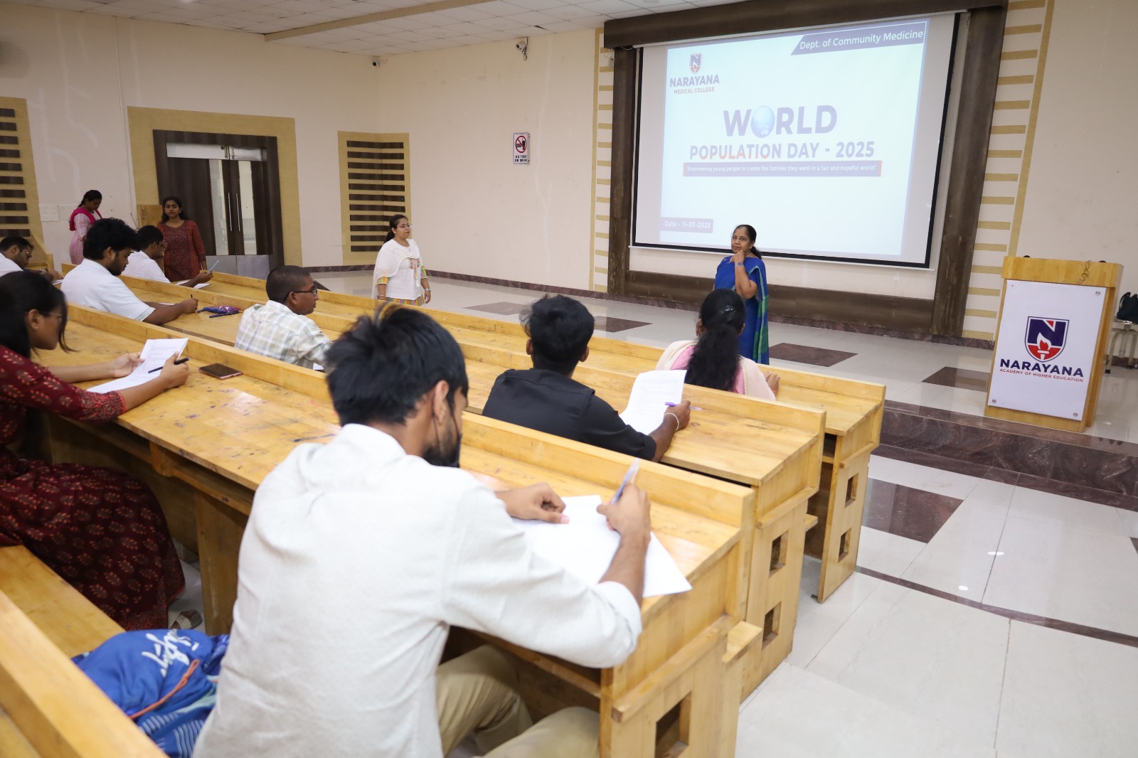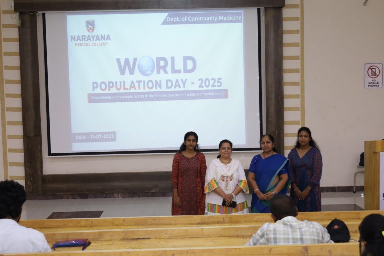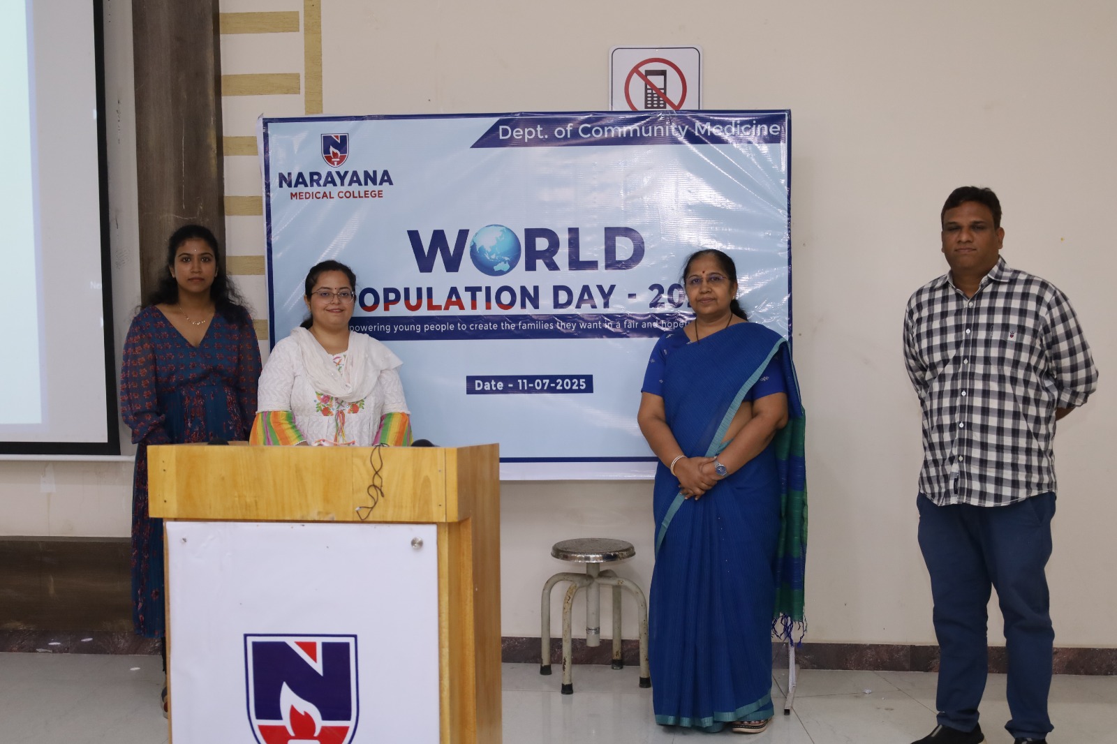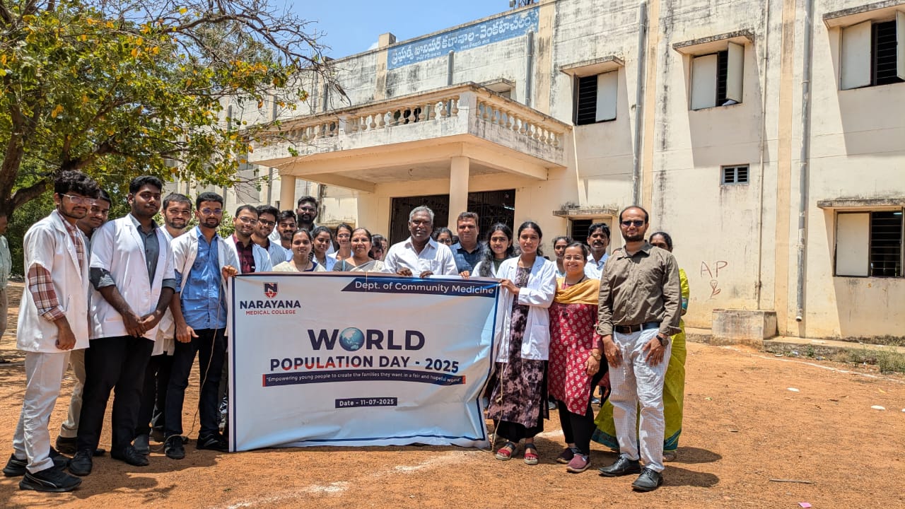 The Department of Community Medicine, Narayana Medical College, successfully organized a series of activities to commemorate World Population Day 2025, aligning with the global mission of raising awareness about the health, social, and environmental impacts of population dynamics. We extend our heartfelt thanks to the administration and management of Narayana Medical College for permitting us to do these activities.