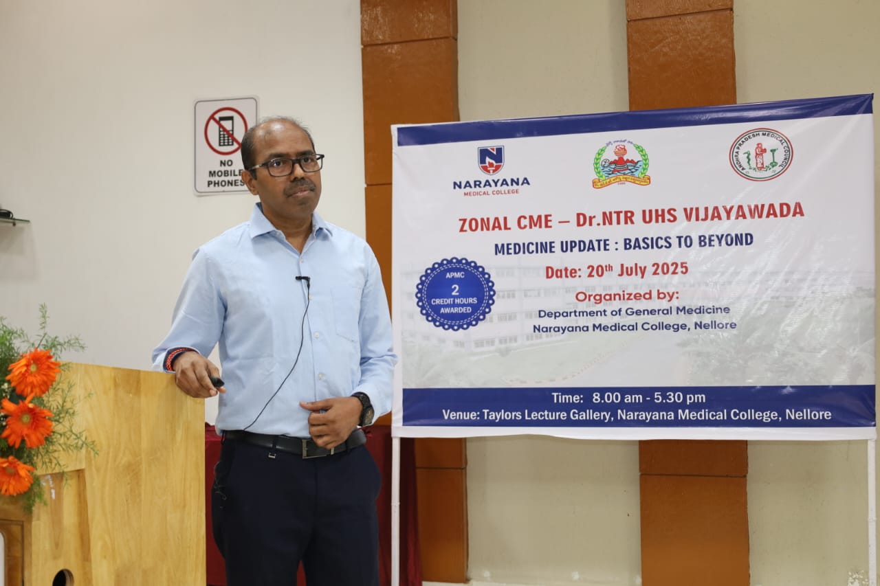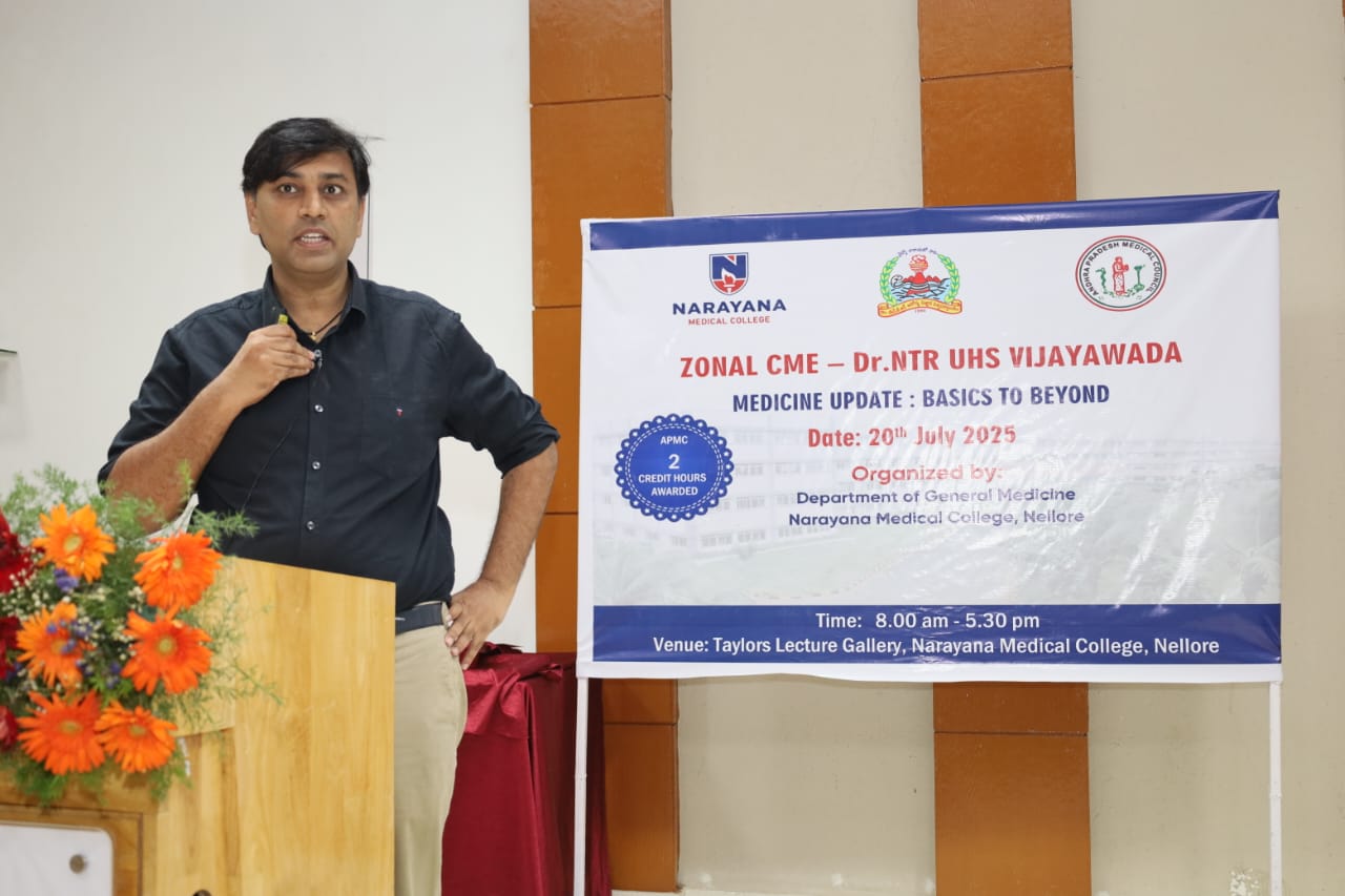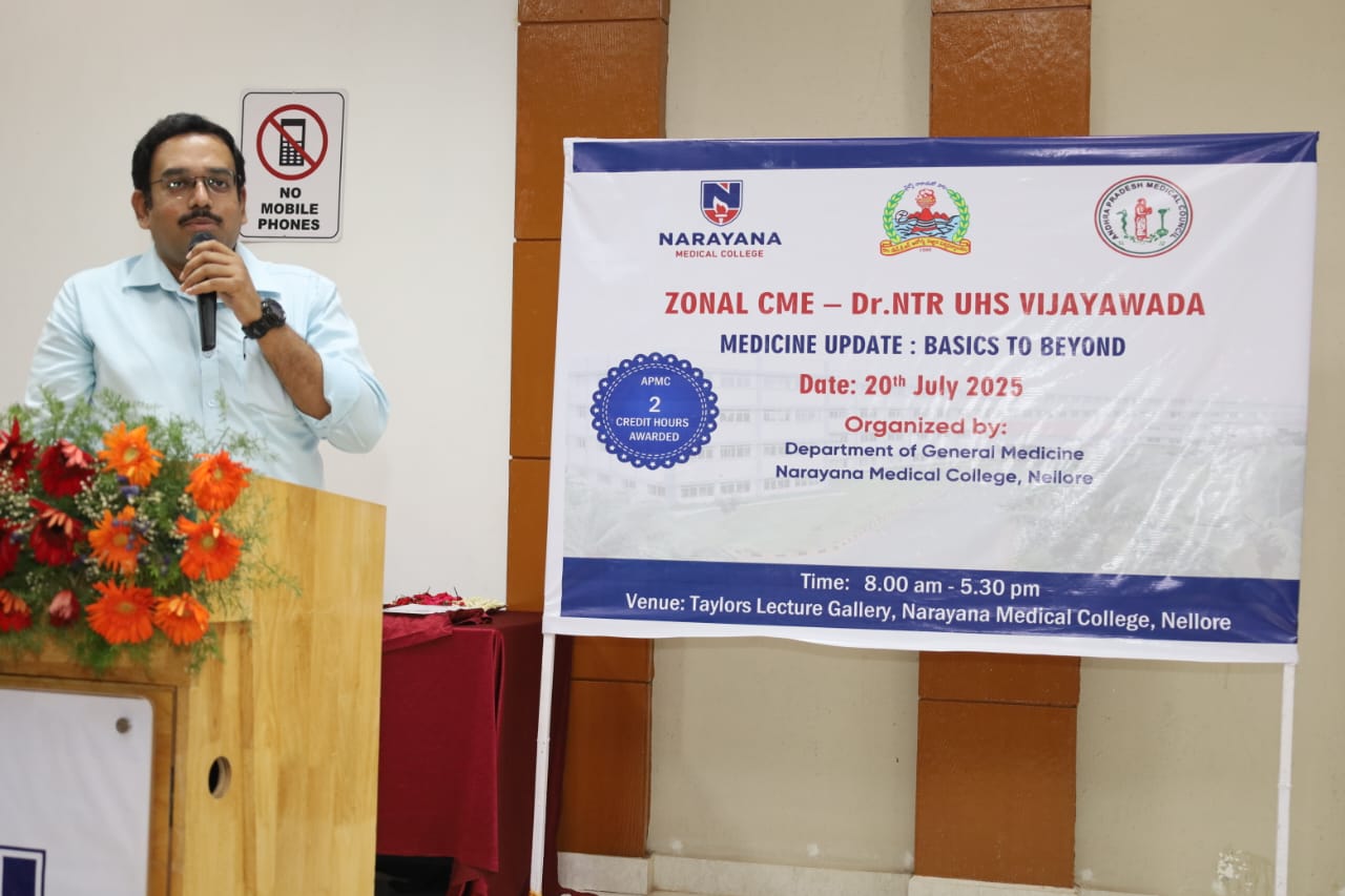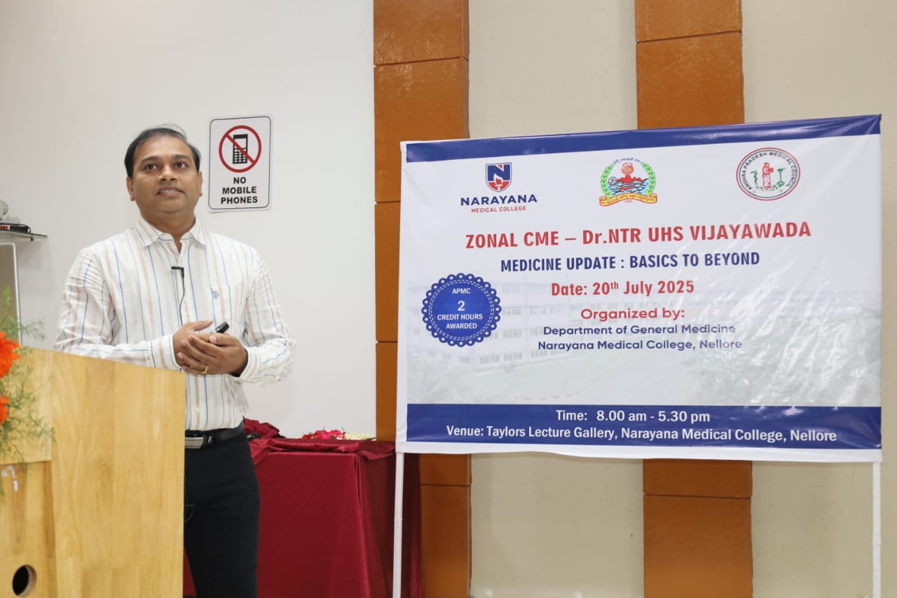 The Zonal CME held on 20th July 2025 at Narayana Medical College, Nellore, was successfully conducted for Postgraduate students from Zone – IV under the auspices of Dr. NTR University of Health Sciences. The event was hosted by the Department of General Medicine, focusing on practical, evidence-based approaches to diagnosis and management of challenging medical conditions across specialties.