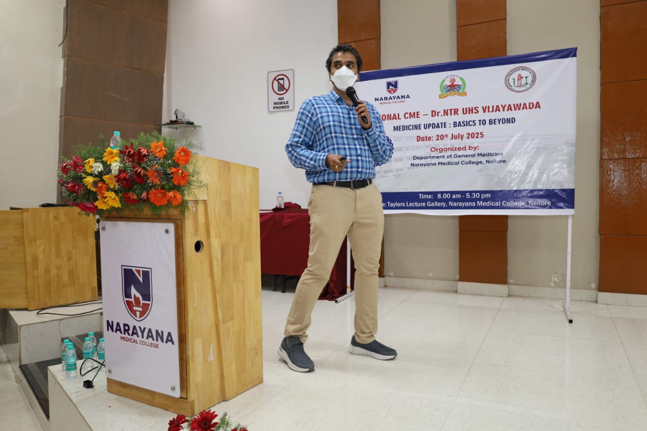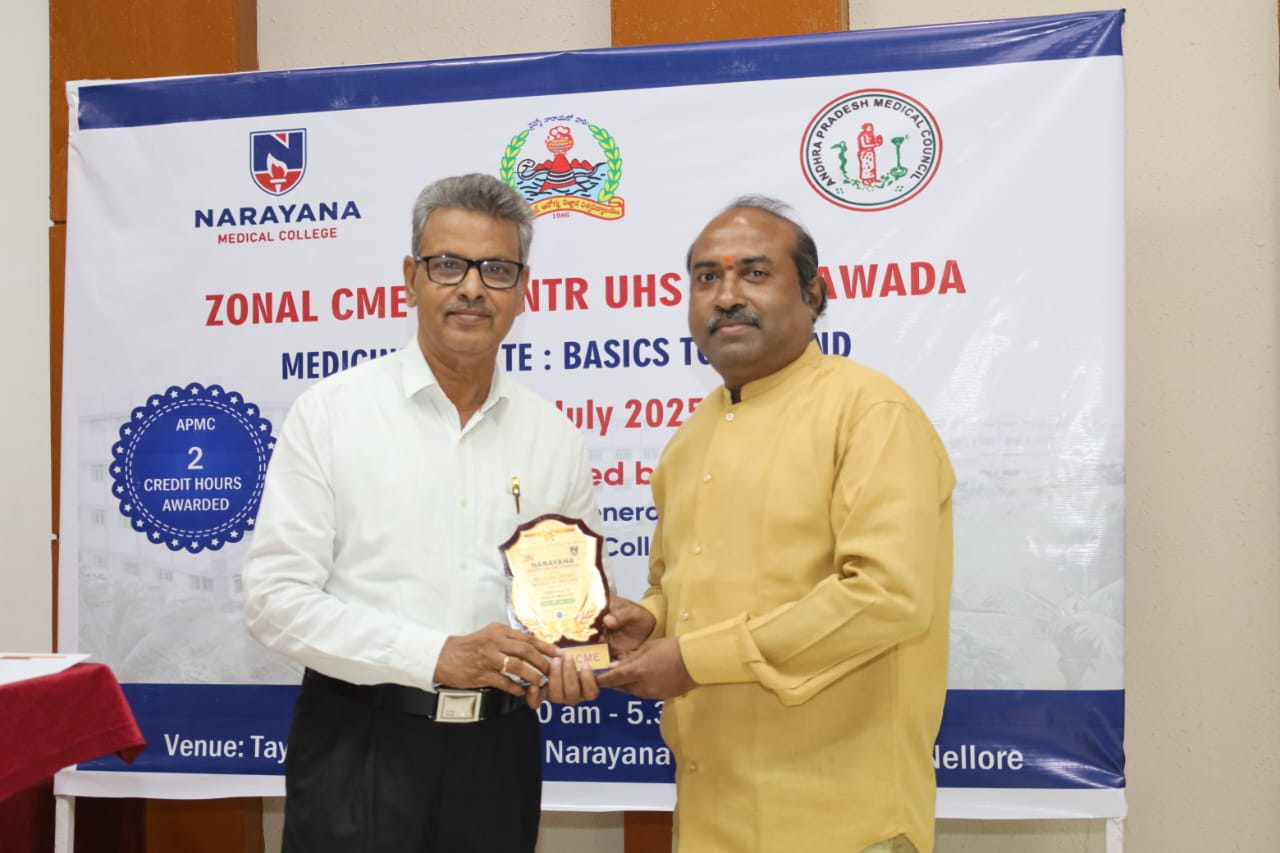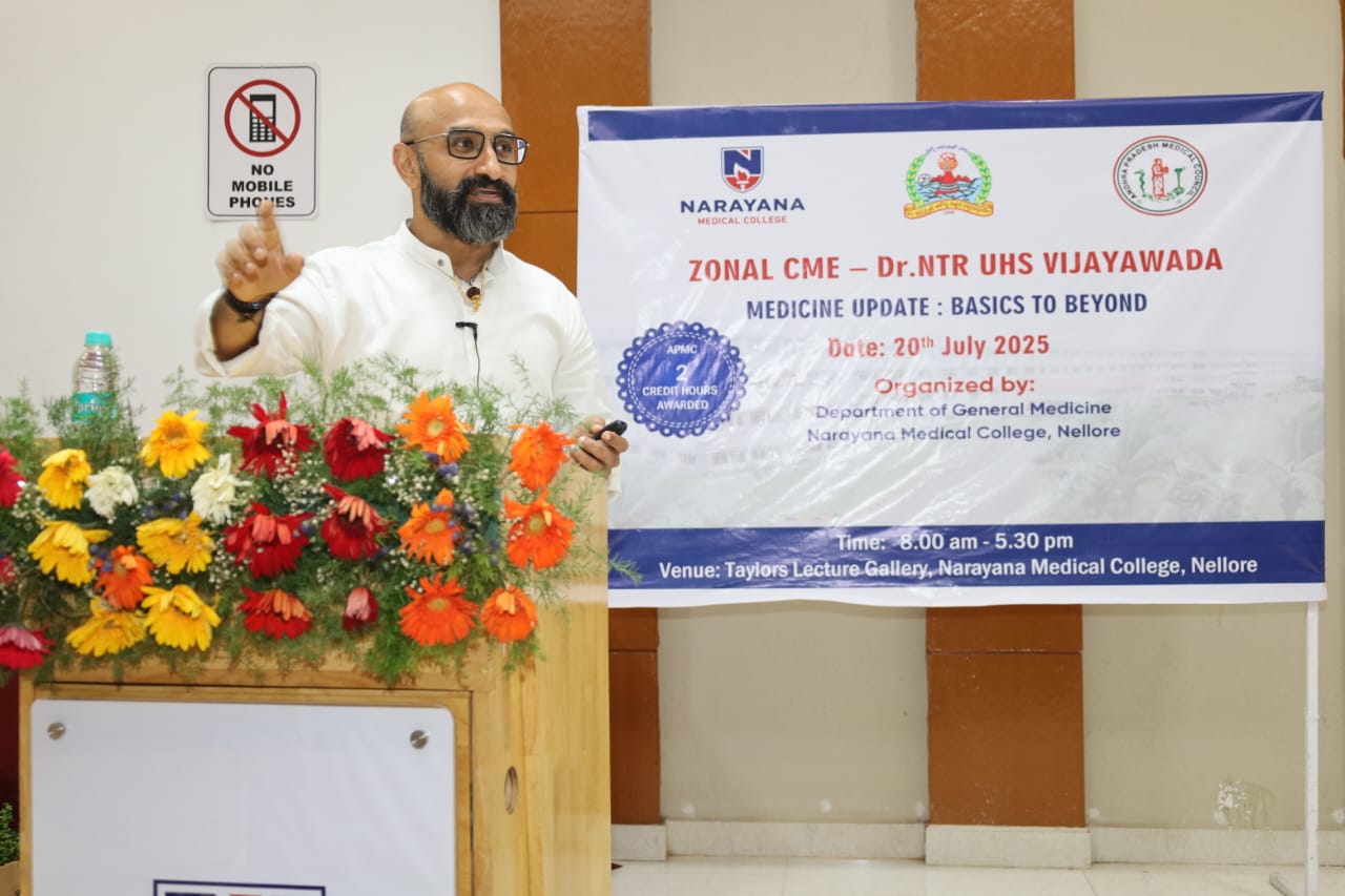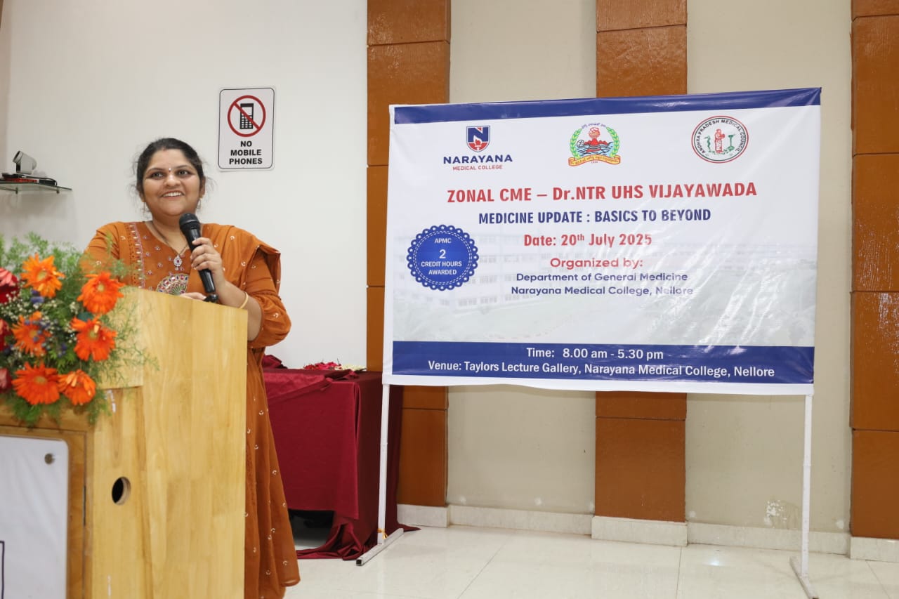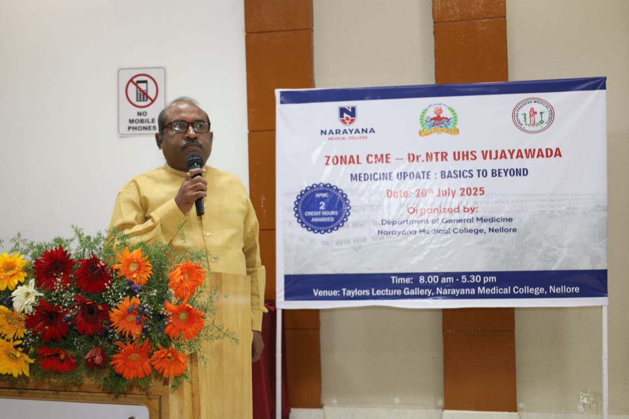 The Zonal CME held on 20th July 2025 at Narayana Medical College, Nellore, was successfully conducted for Postgraduate students from Zone – IV under the auspices of Dr. NTR University of Health Sciences. The event was hosted by the Department of General Medicine, focusing on practical, evidence-based approaches to diagnosis and management of challenging medical conditions across specialties.