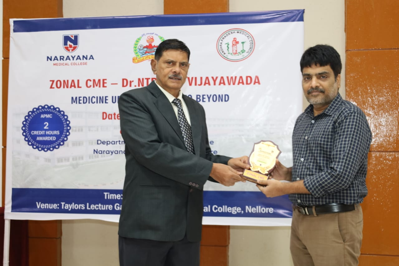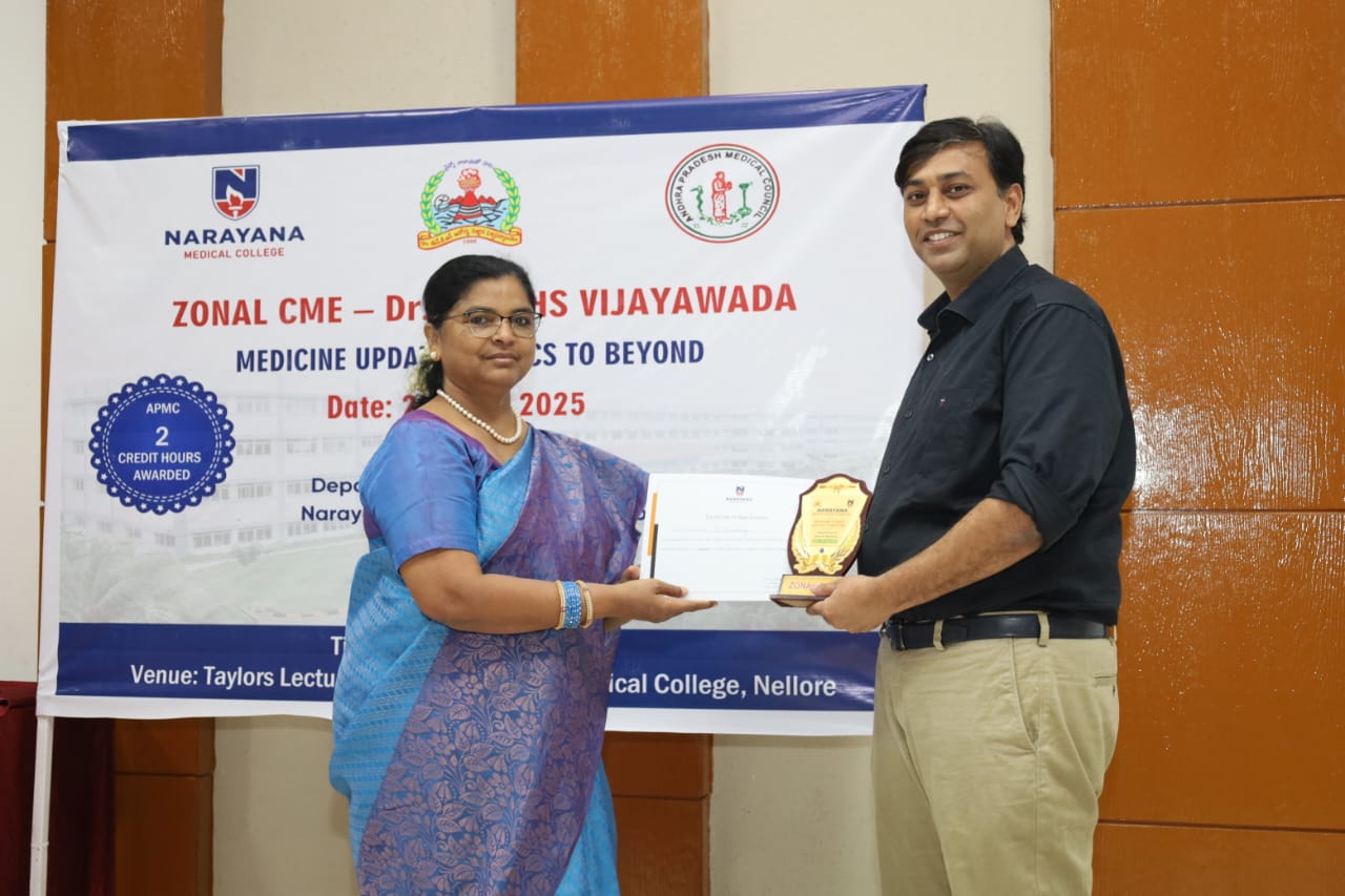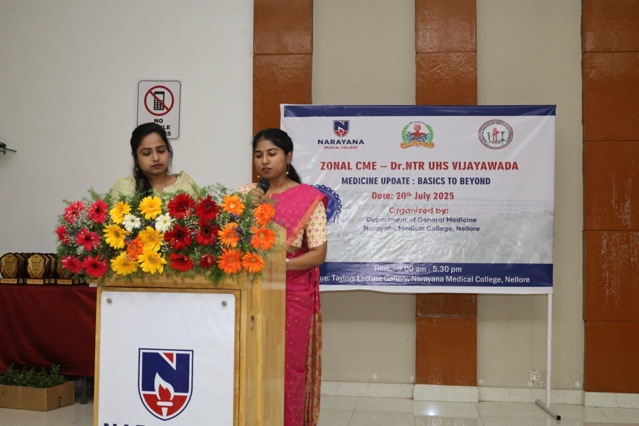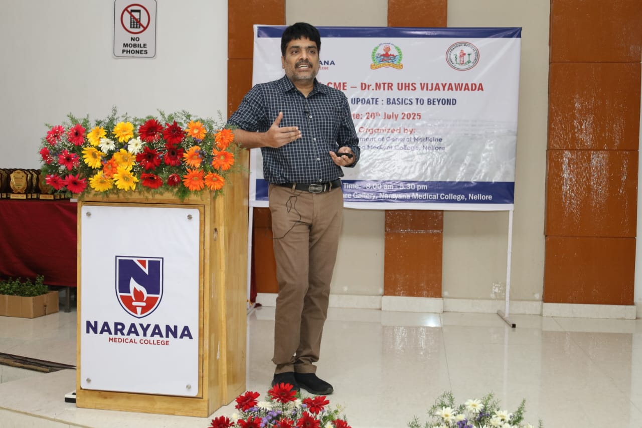 The Zonal CME held on 20th July 2025 at Narayana Medical College, Nellore, was successfully conducted for Postgraduate students from Zone – IV under the auspices of Dr. NTR University of Health Sciences. The event was hosted by the Department of General Medicine, focusing on practical, evidence-based approaches to diagnosis and management of challenging medical conditions across specialties.
