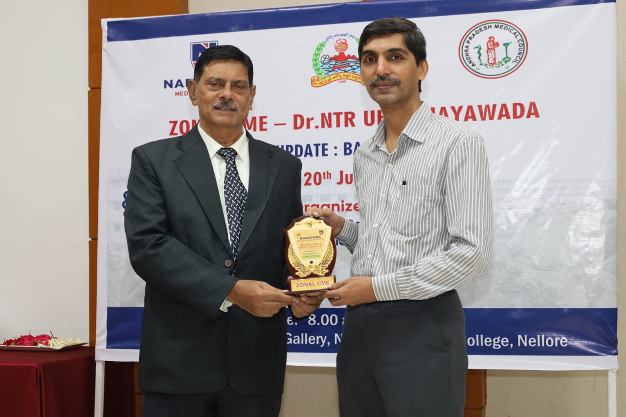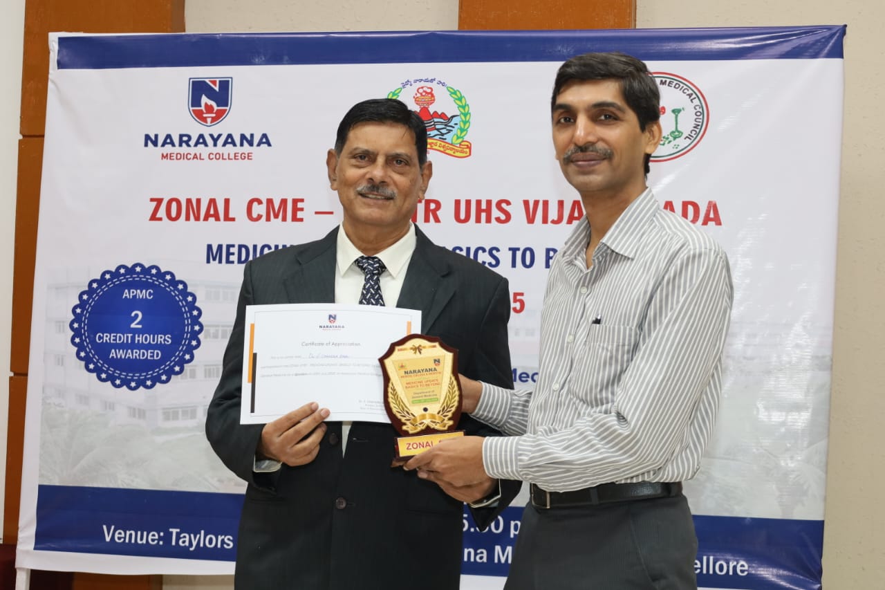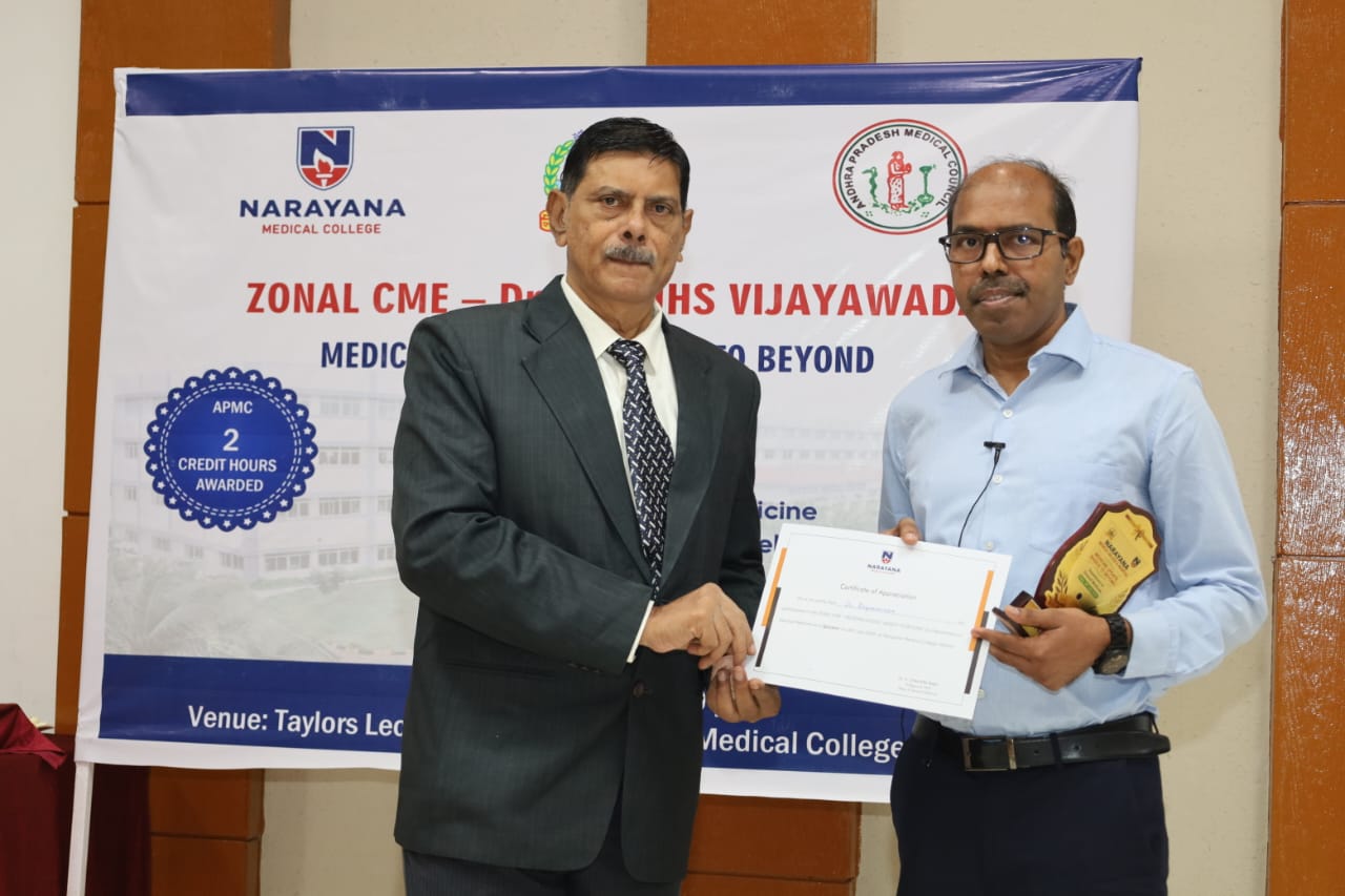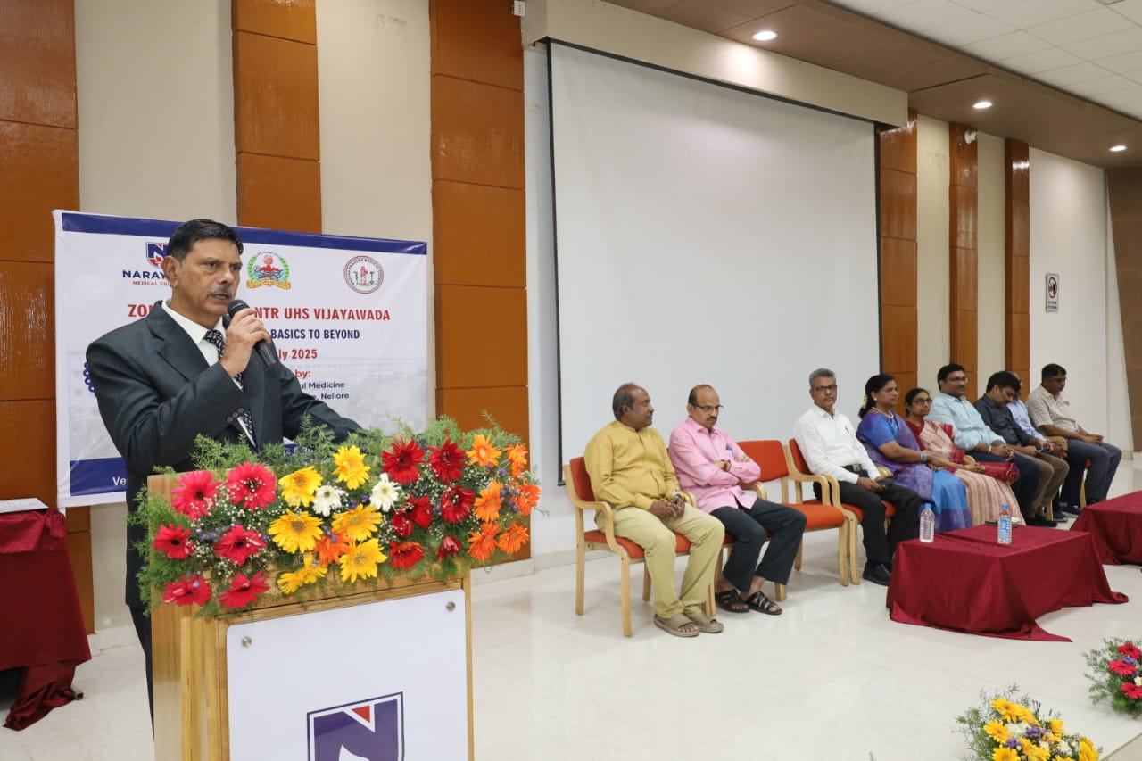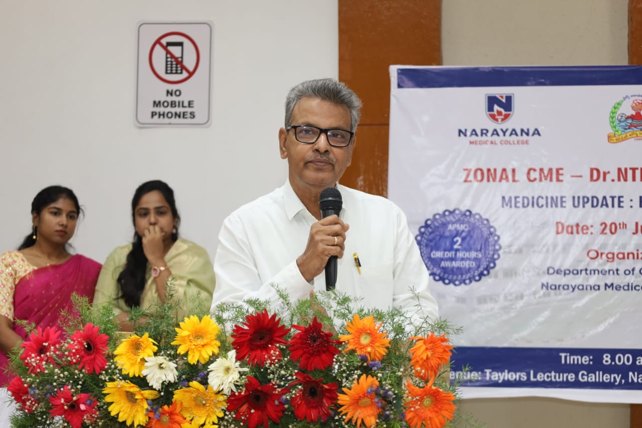 The Zonal CME held on 20th July 2025 at Narayana Medical College, Nellore, was successfully conducted for Postgraduate students from Zone – IV under the auspices of Dr. NTR University of Health Sciences. The event was hosted by the Department of General Medicine, focusing on practical, evidence-based approaches to diagnosis and management of challenging medical conditions across specialties.