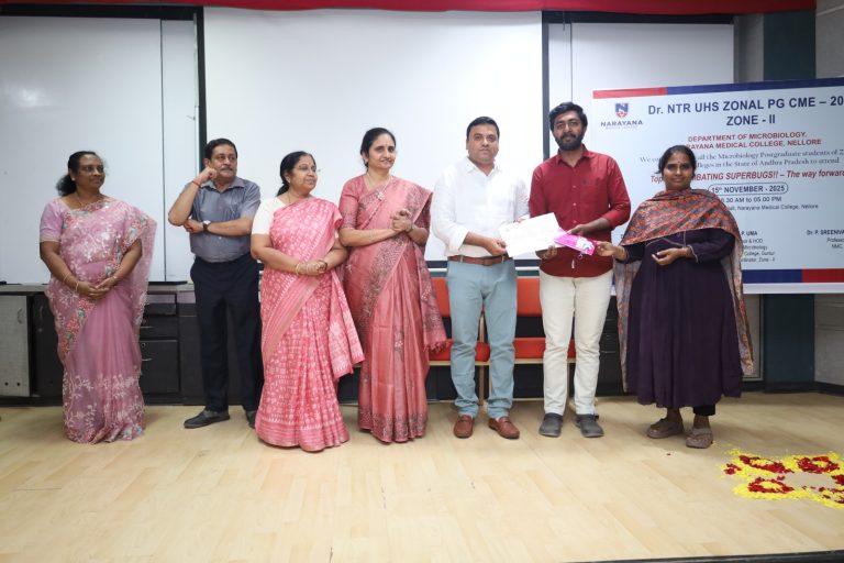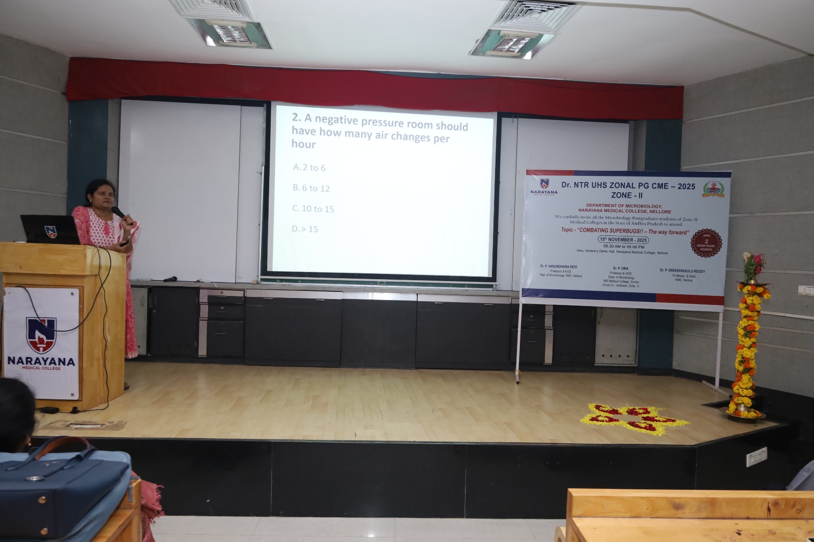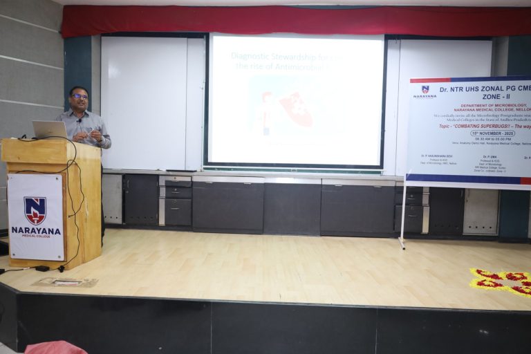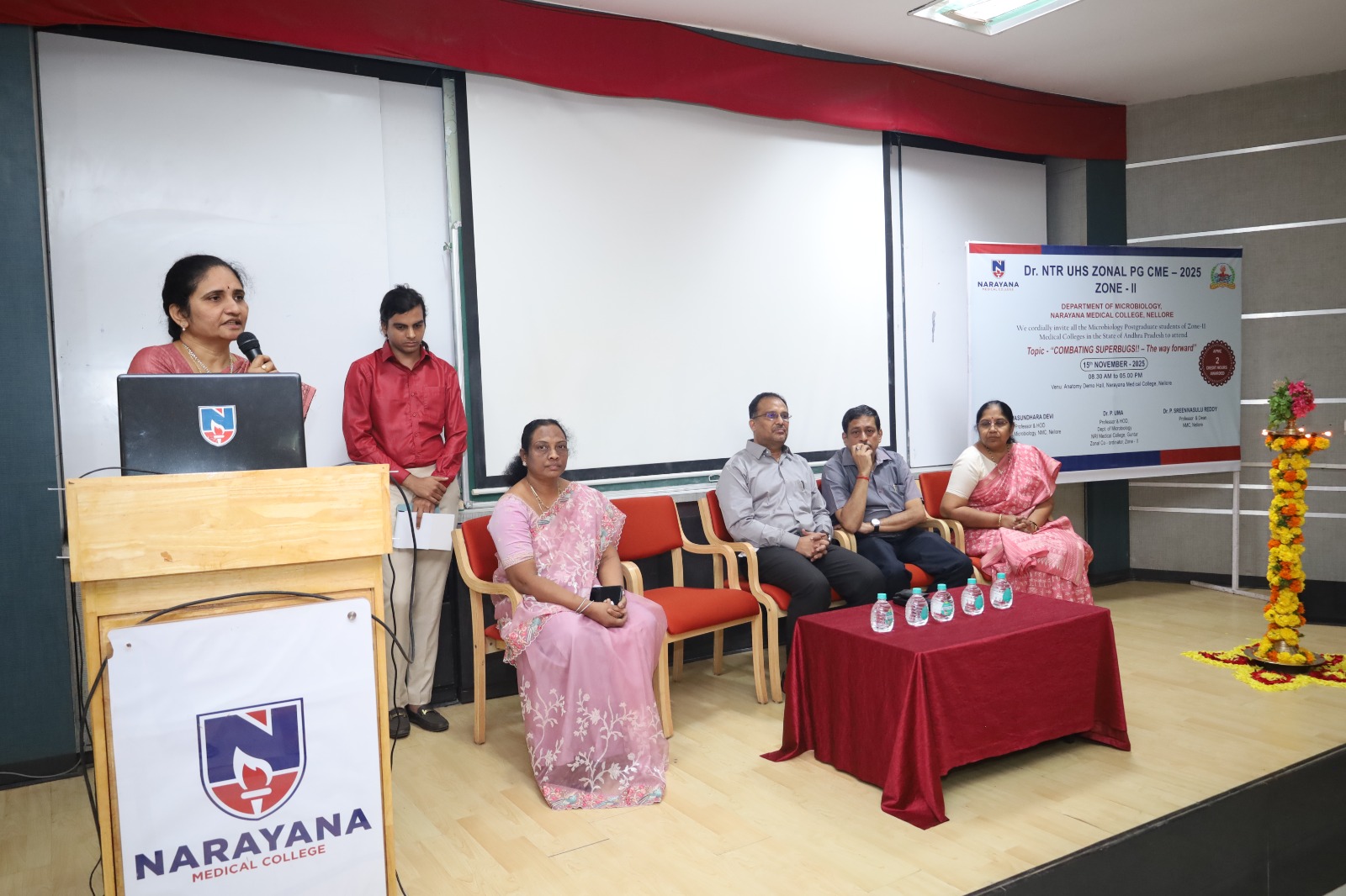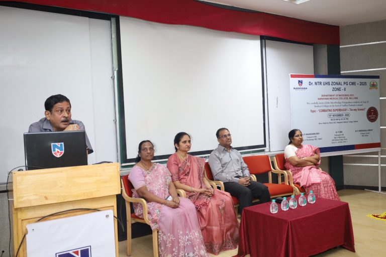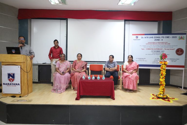 The Dr NTRUHS Zonal CME 2025 on “Combating Superbugs – The Way Forward” was organized by the Department of Microbiology, Narayana Medical College, Nellore, on 15 November 2025. The programme brought together faculties and postgraduates from multiple specialties to strengthen clinical understanding and preparedness against the rising challenge of antimicrobial resistance (AMR).