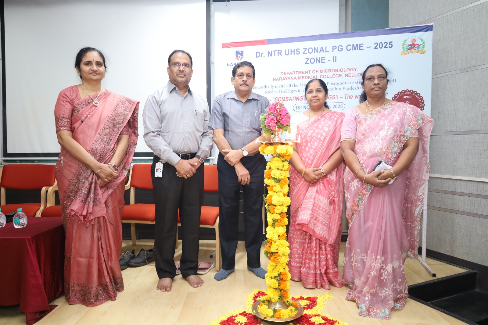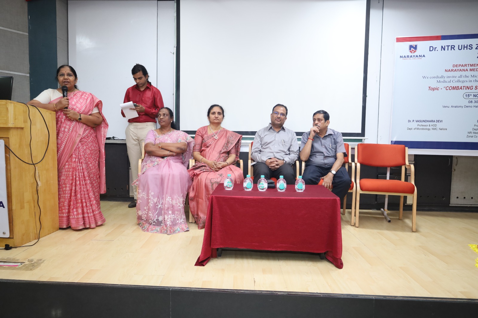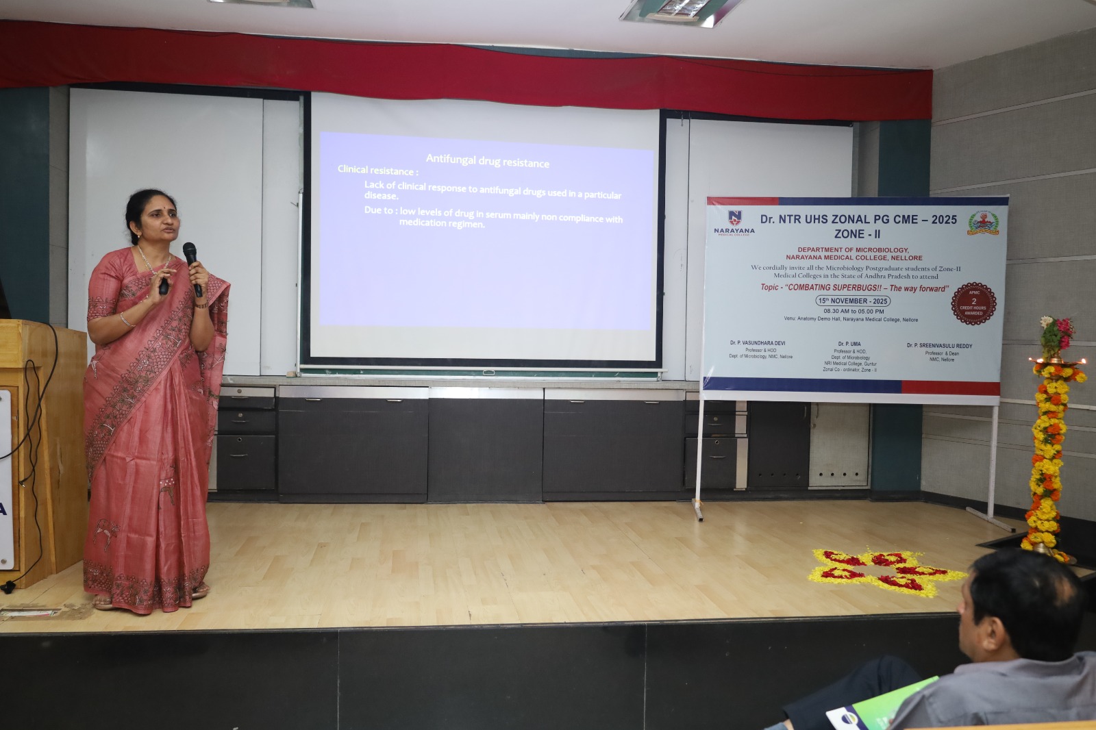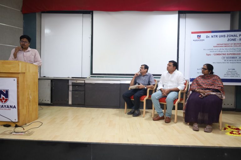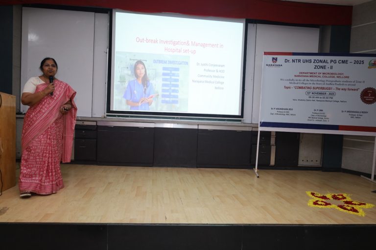 The Dr NTRUHS Zonal CME 2025 on “Combating Superbugs – The Way Forward” was organized by the Department of Microbiology, Narayana Medical College, Nellore, on 15 November 2025. The programme brought together faculties and postgraduates from multiple specialties to strengthen clinical understanding and preparedness against the rising challenge of antimicrobial resistance (AMR).